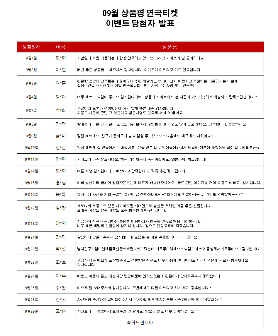 title : 2020년 09월 상품평 연극티켓 이벤트 [당첨자발표]