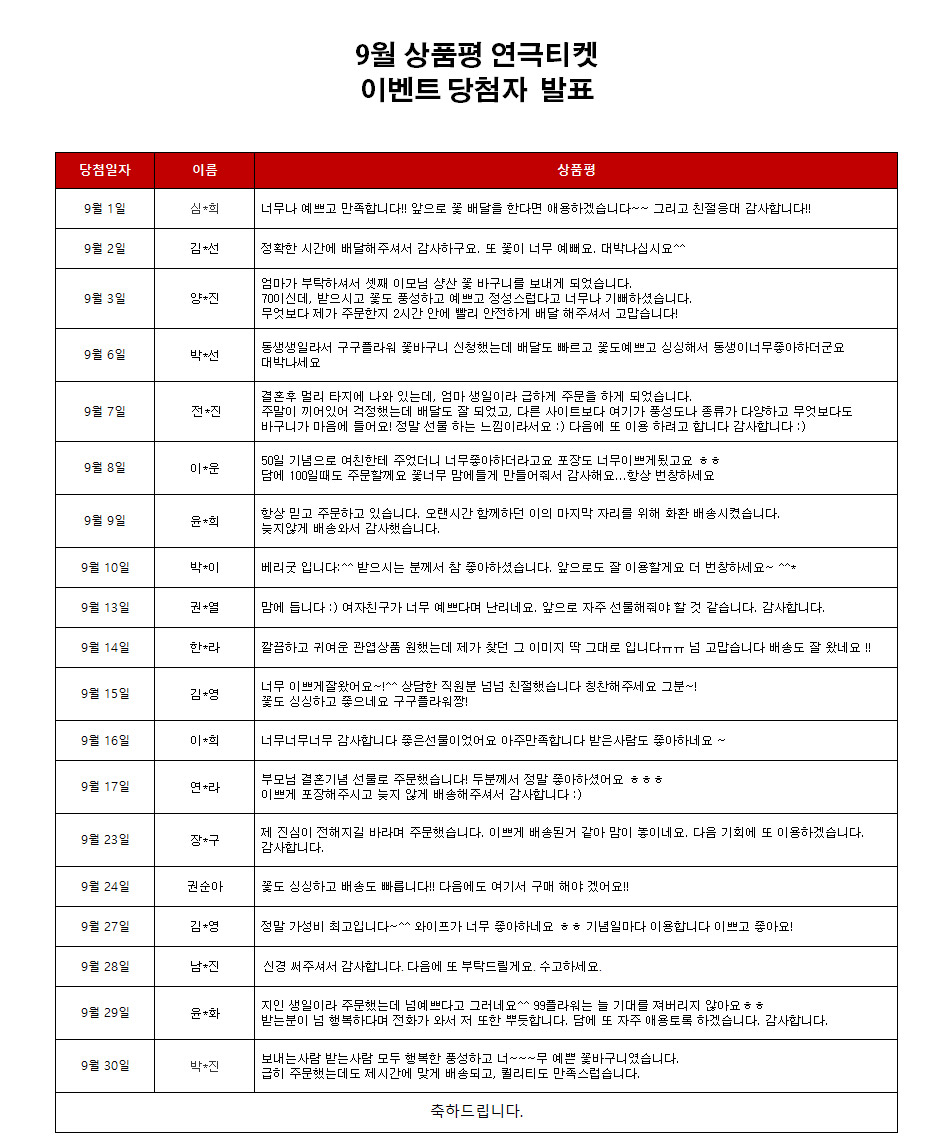 title : 2021년 9월 상품평 연극티켓 이벤트 [당첨자발표]