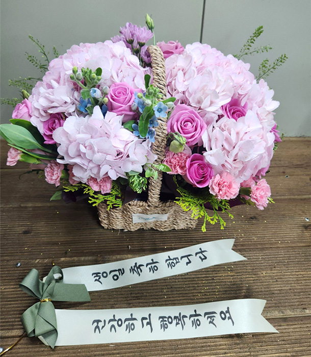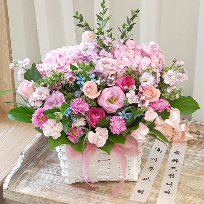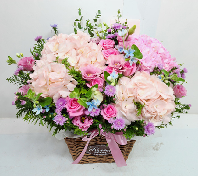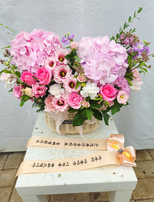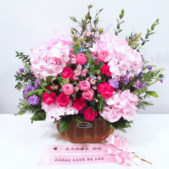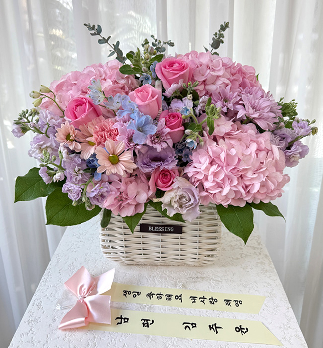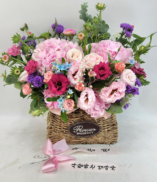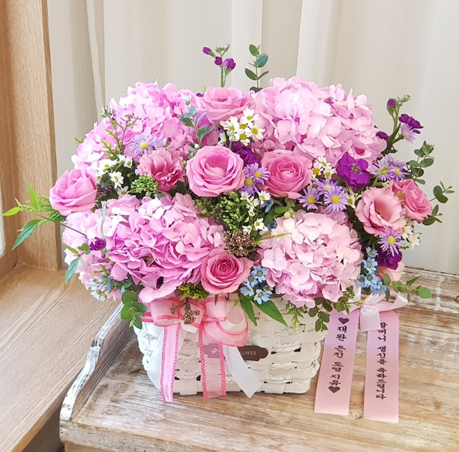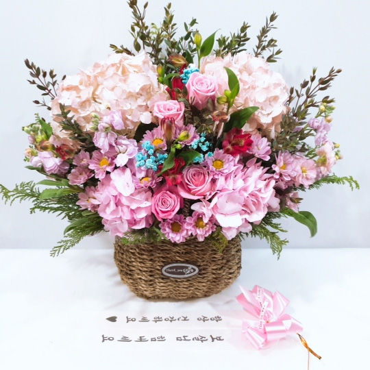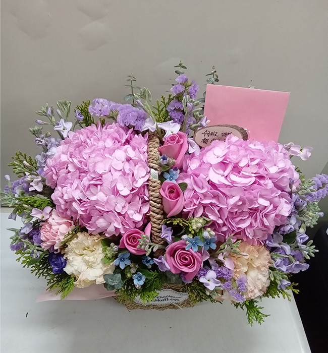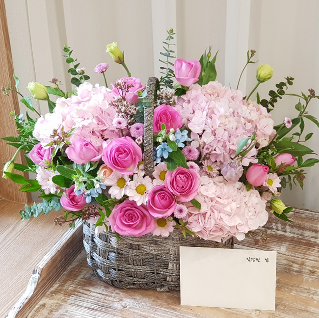 수국, 핑크장미, 각종 계절꽃, 계절 그린소재, 수제바구니, 리본 또는 카드.
