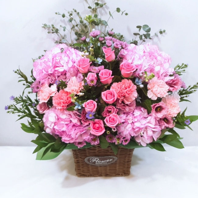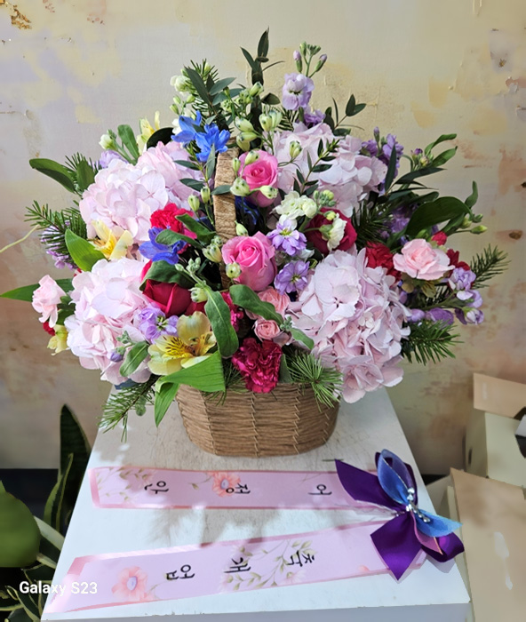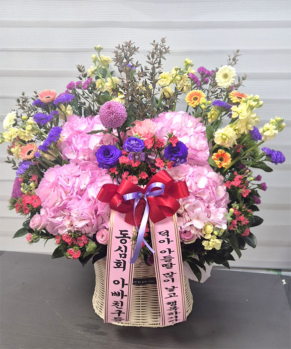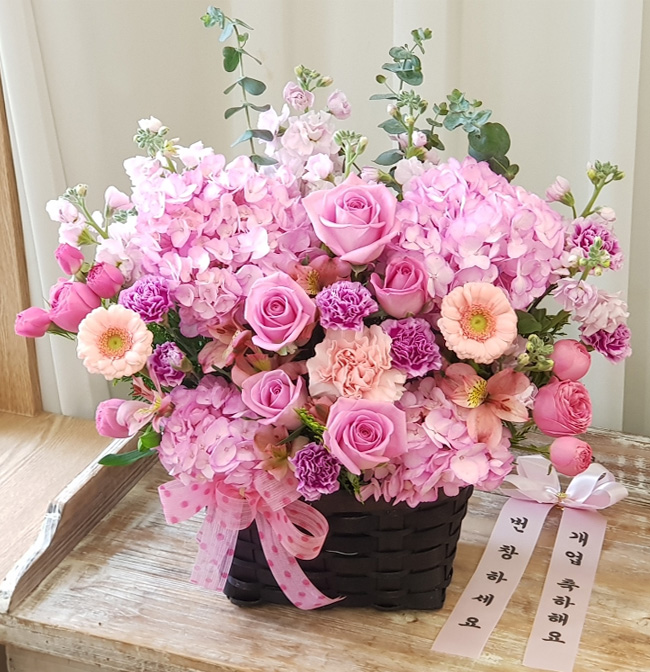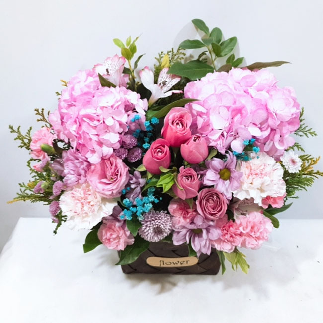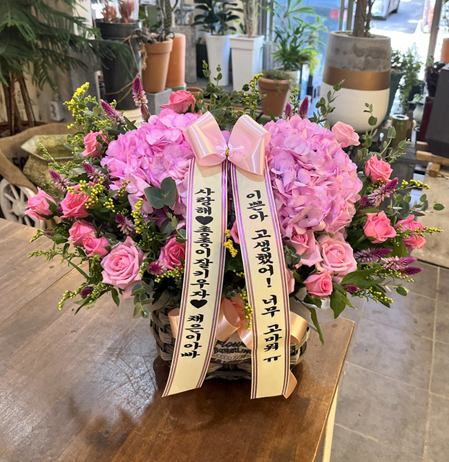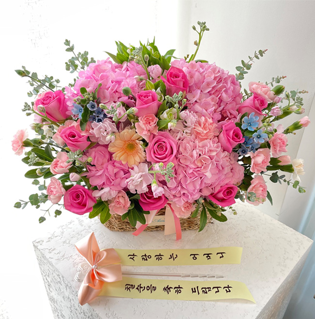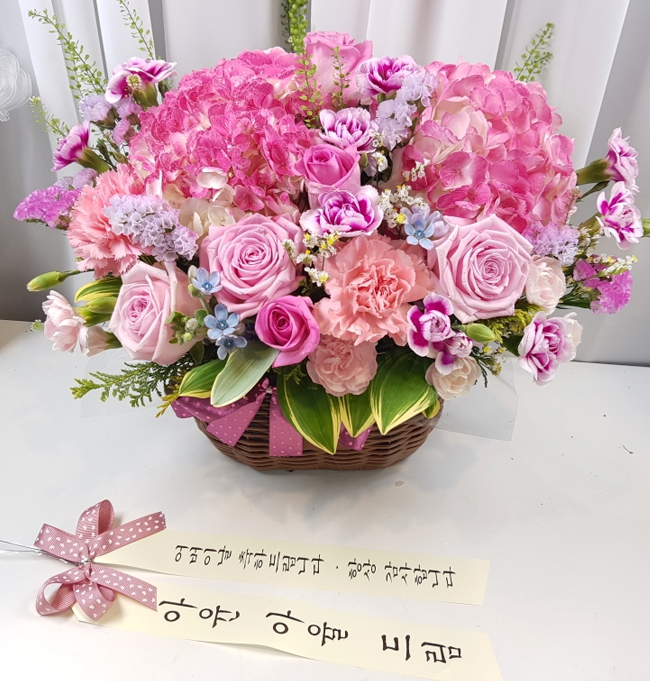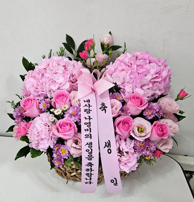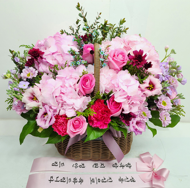 수국, 핑크장미, 각종 계절꽃, 계절 그린소재, 수제바구니, 리본 또는 카드.
