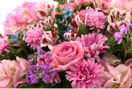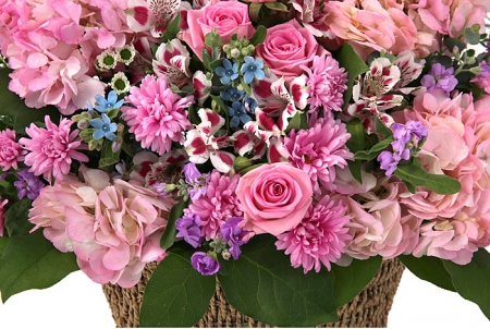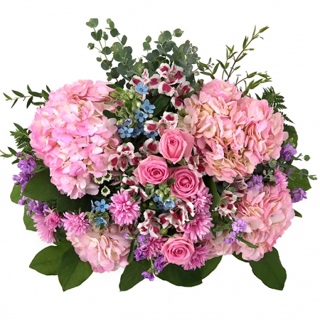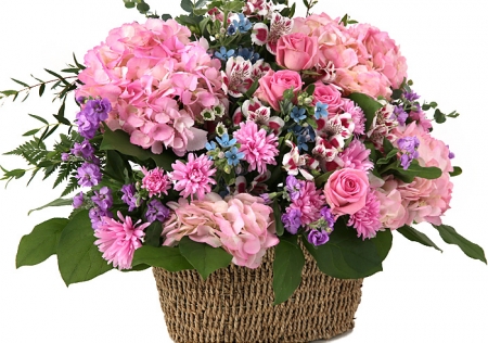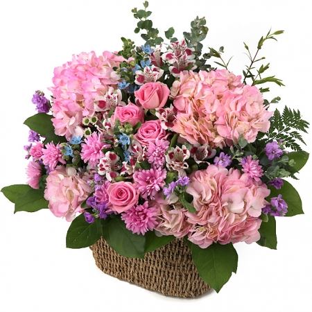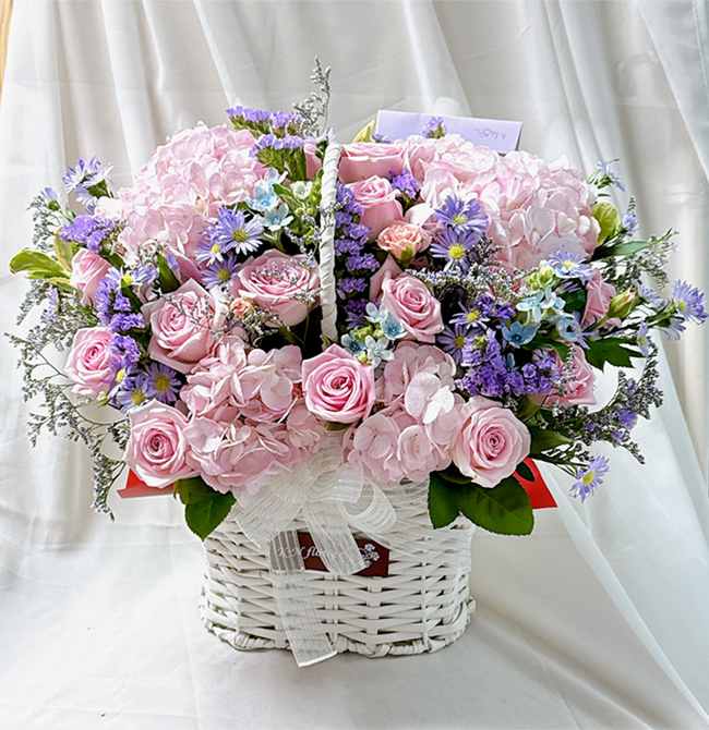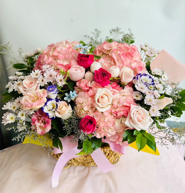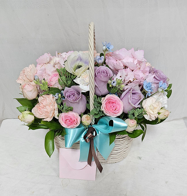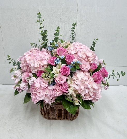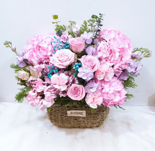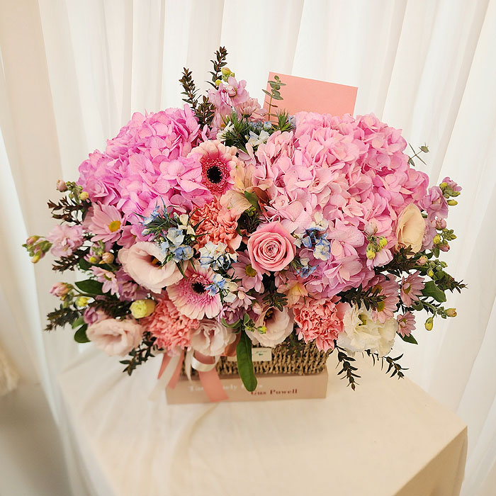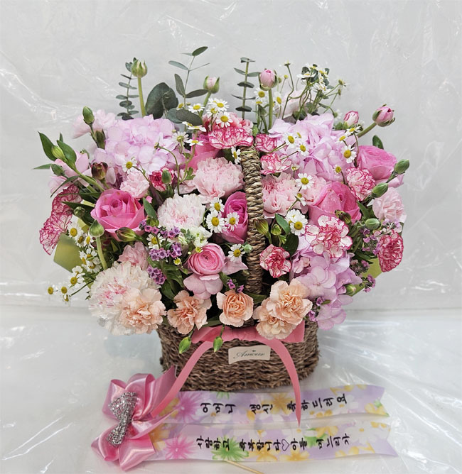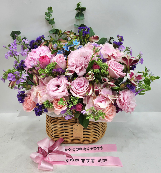 수국, 핑크장미, 각종 계절꽃, 계절 그린소재, 수제바구니, 리본 또는 카드.