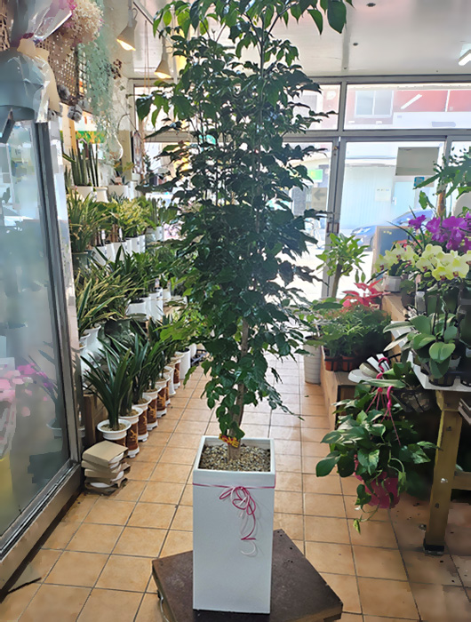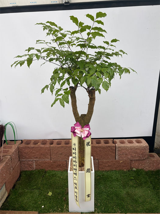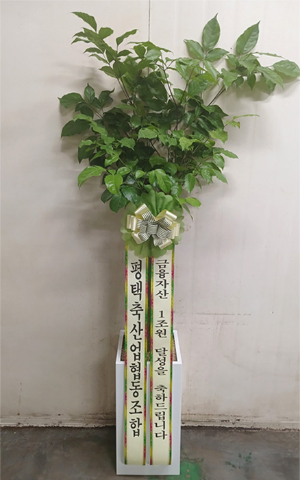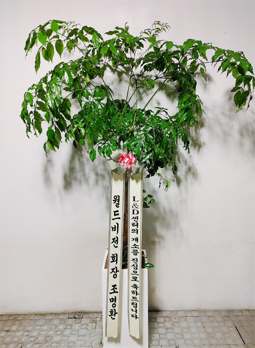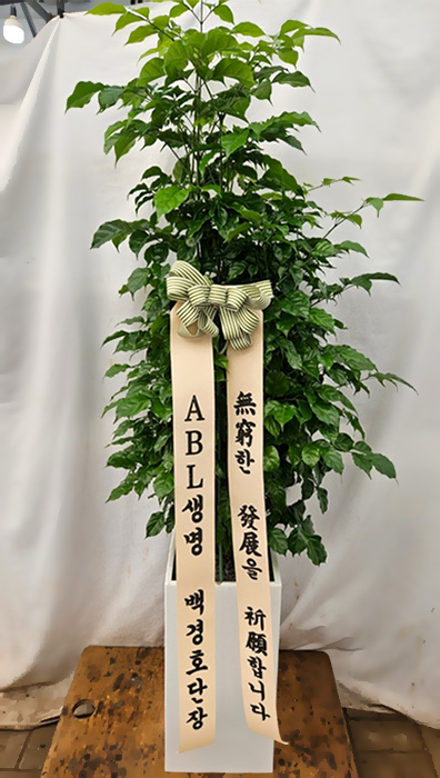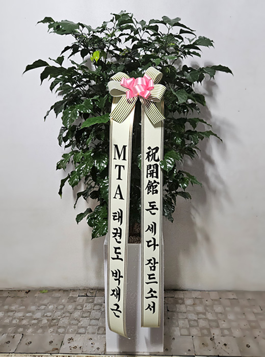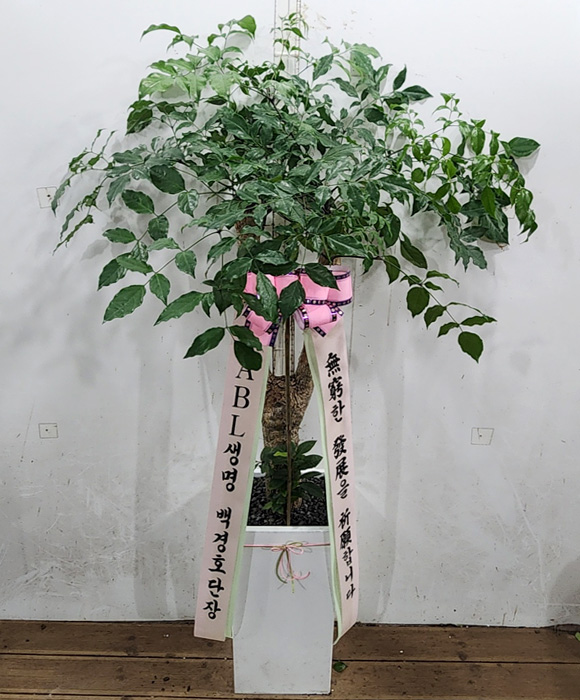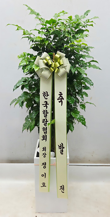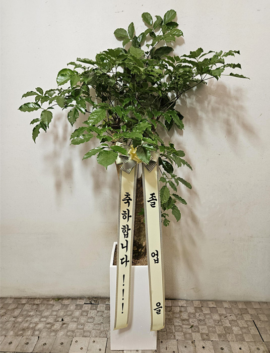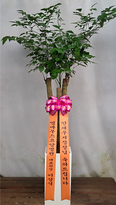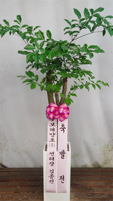 행복나무, 계절 초화, 축하 메세지 리본 또는 카드.