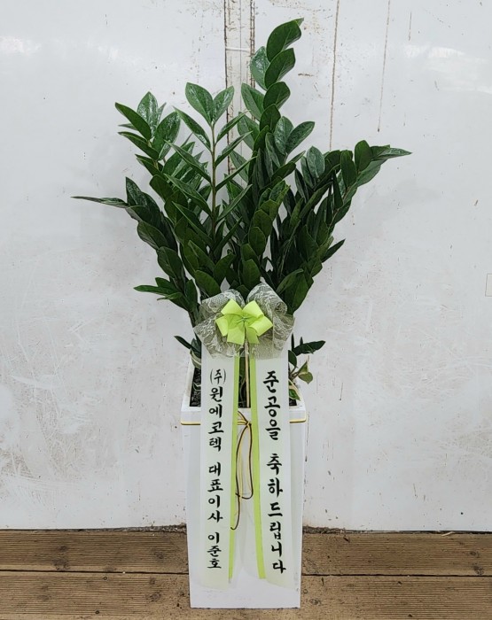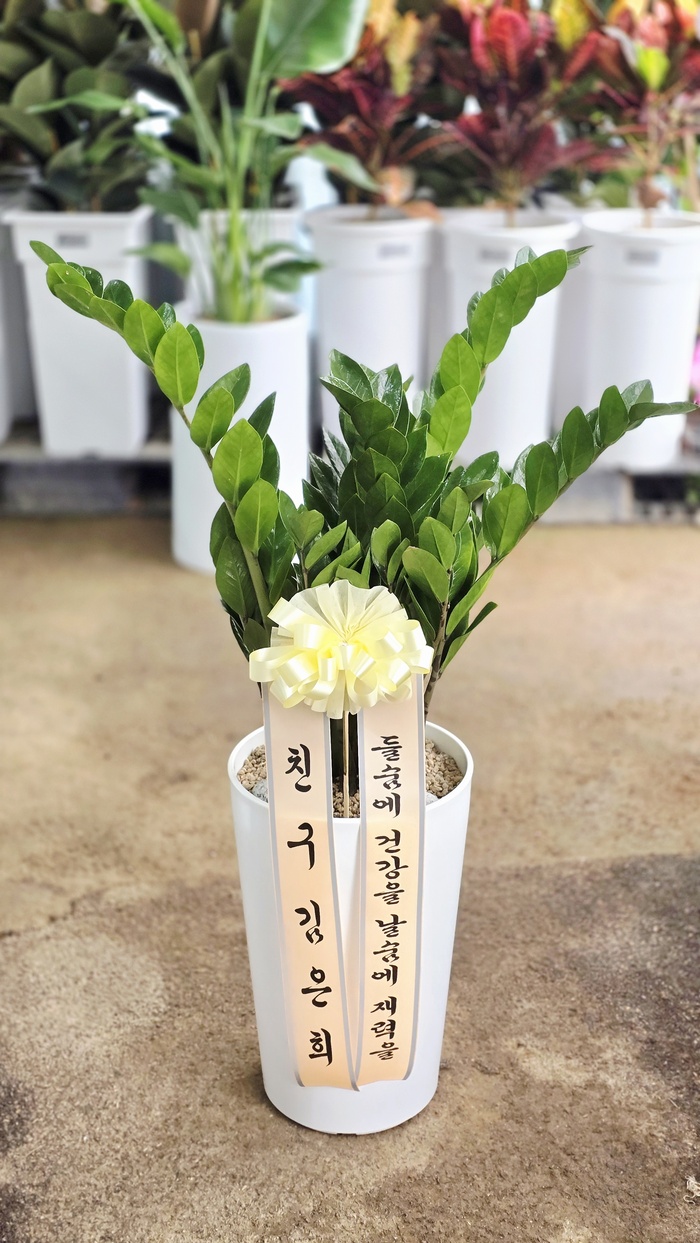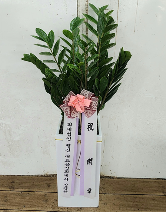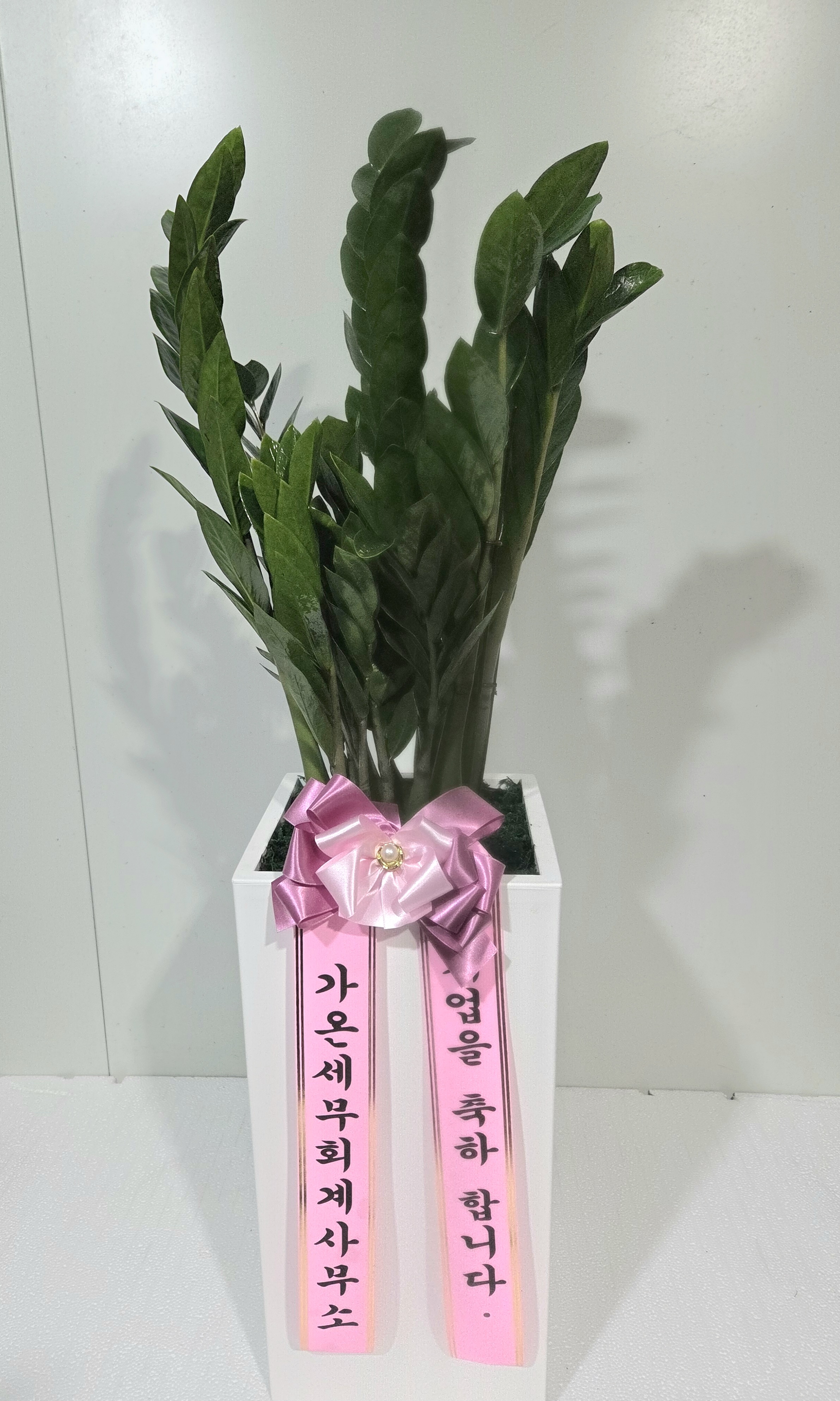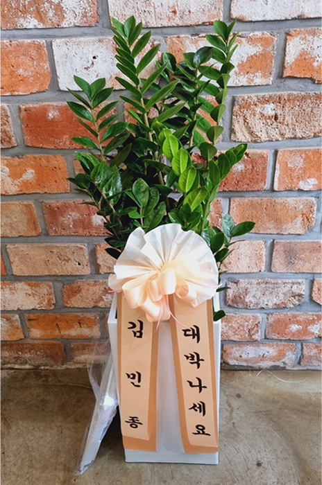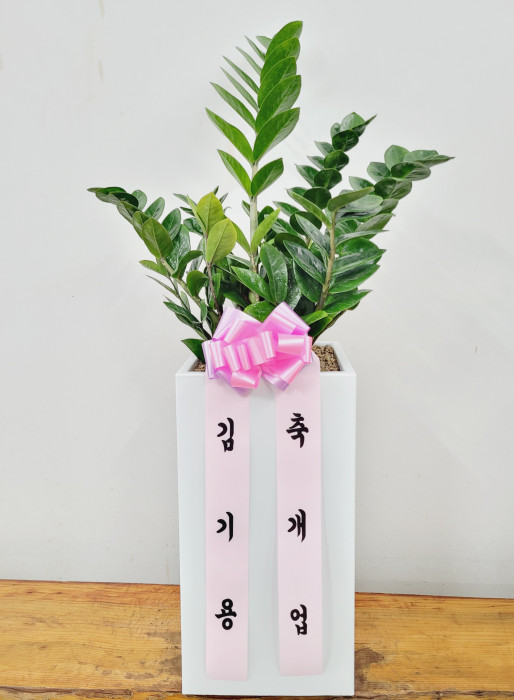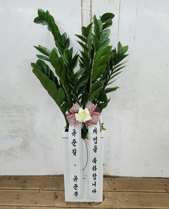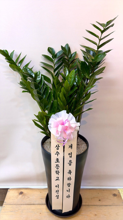 금전수, 계절 초화, 축하 메세지 리본 또는 카드.
