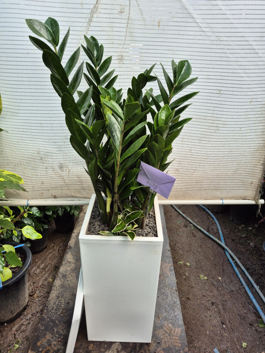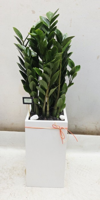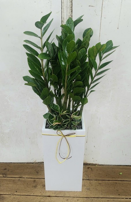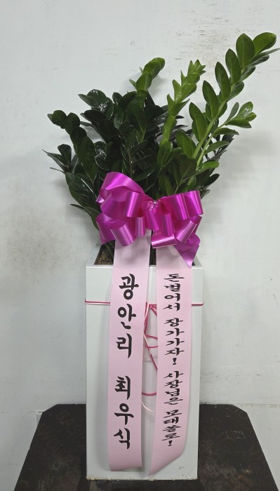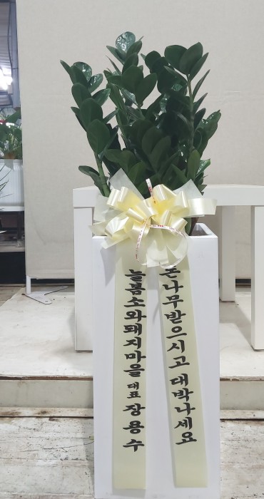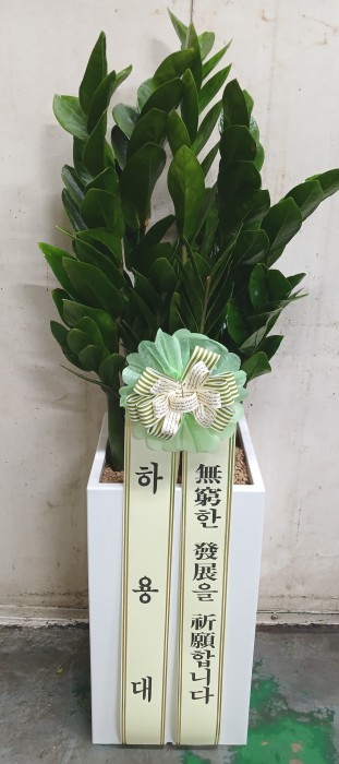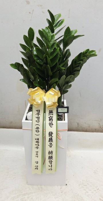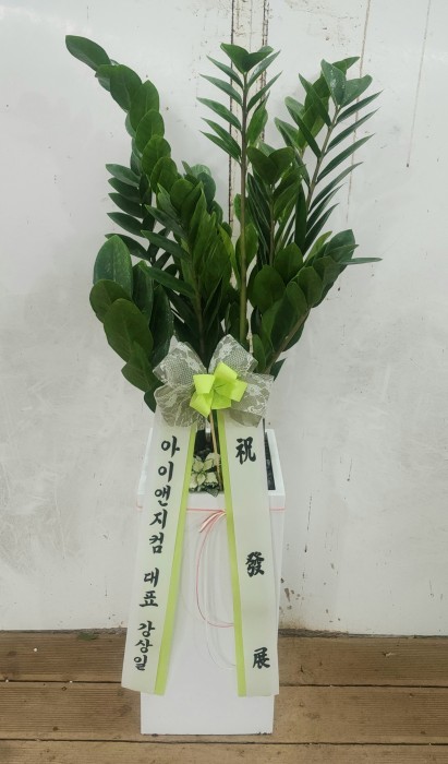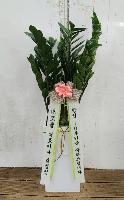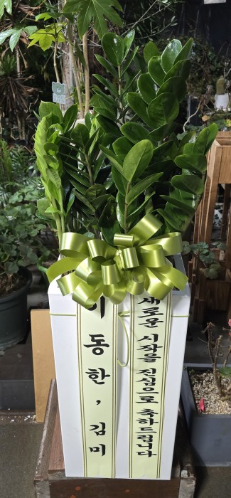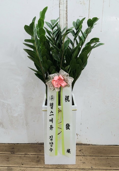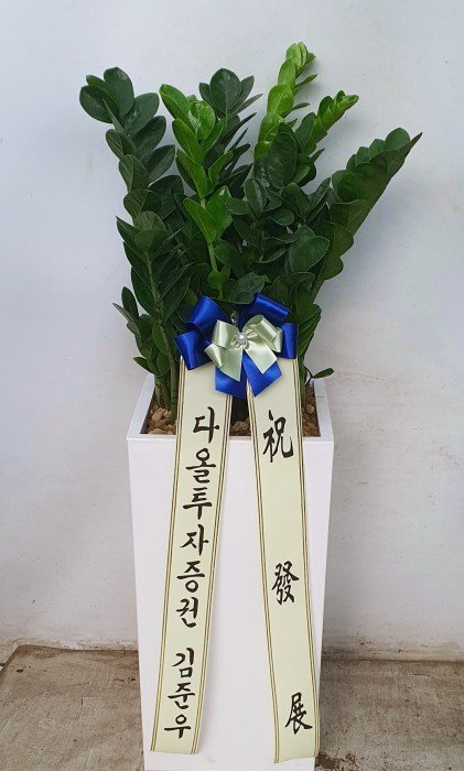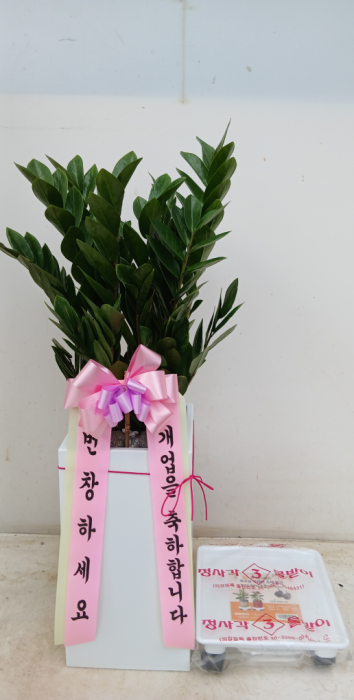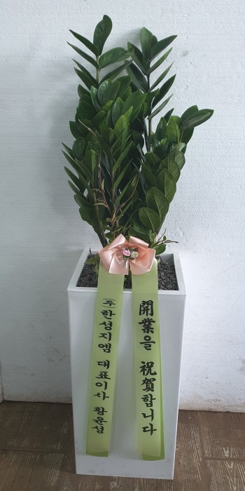 금전수, 계절 초화, 축하 메세지 리본 또는 카드.